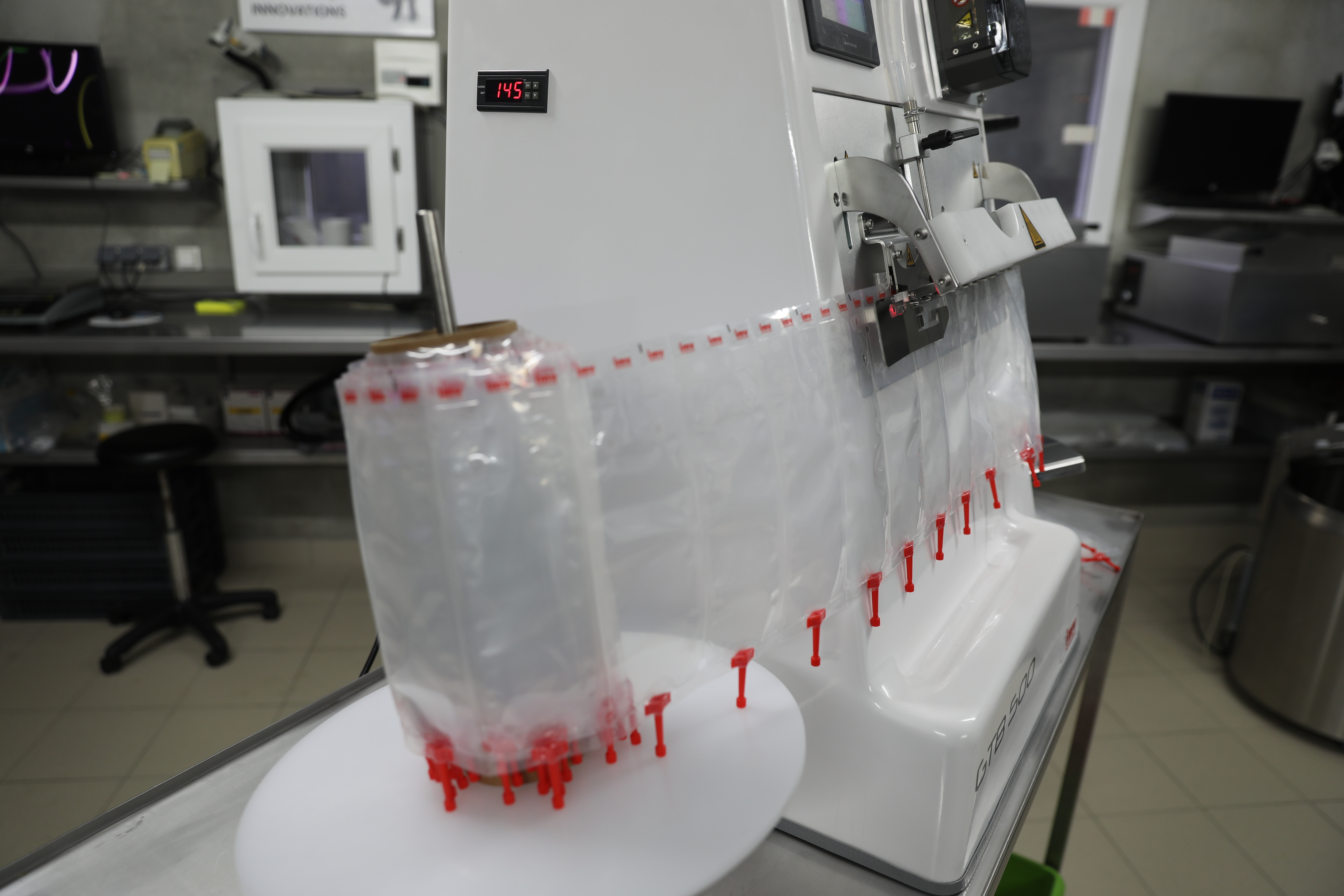Une machine automatique de remplissage et de scellage pour sacs de semence porcine, conçue pour les unités de production de capacité intermédiaire (10 à 50 verrats).